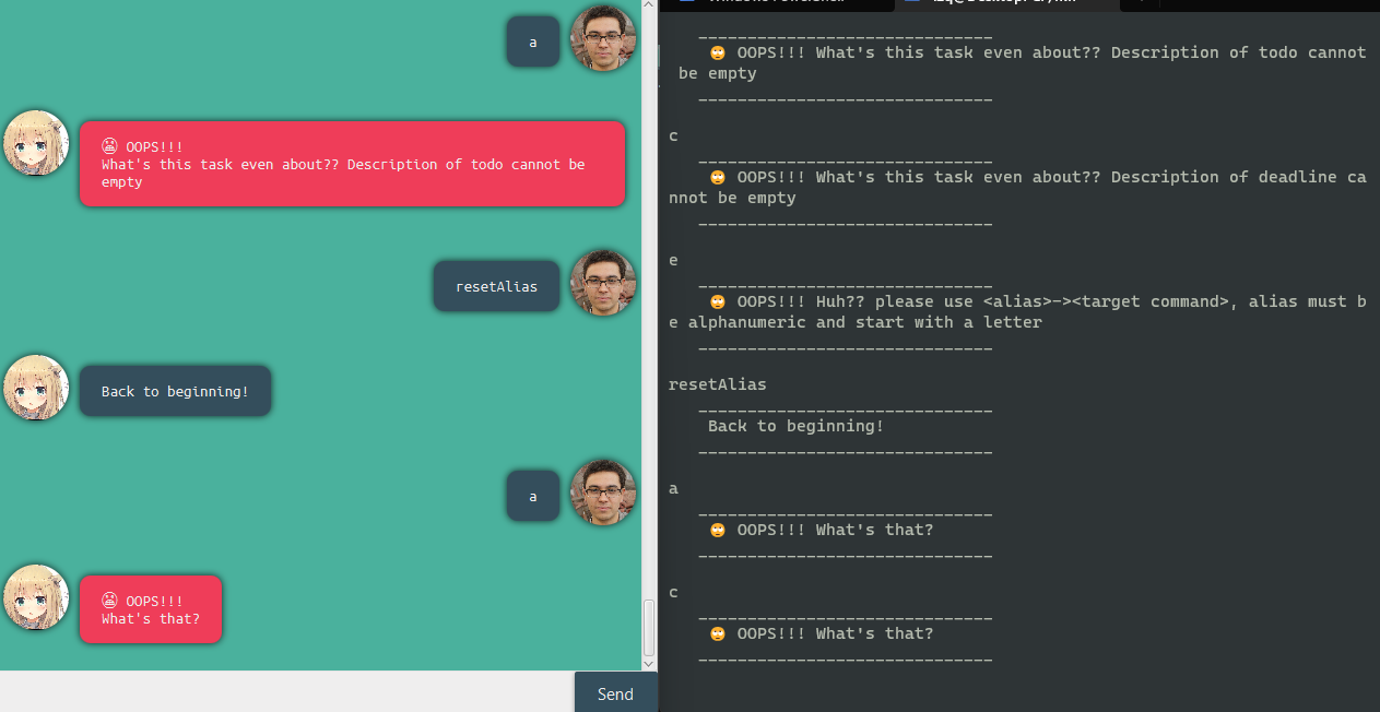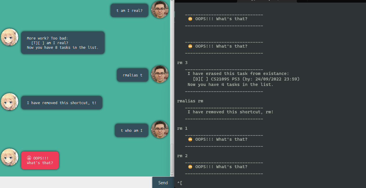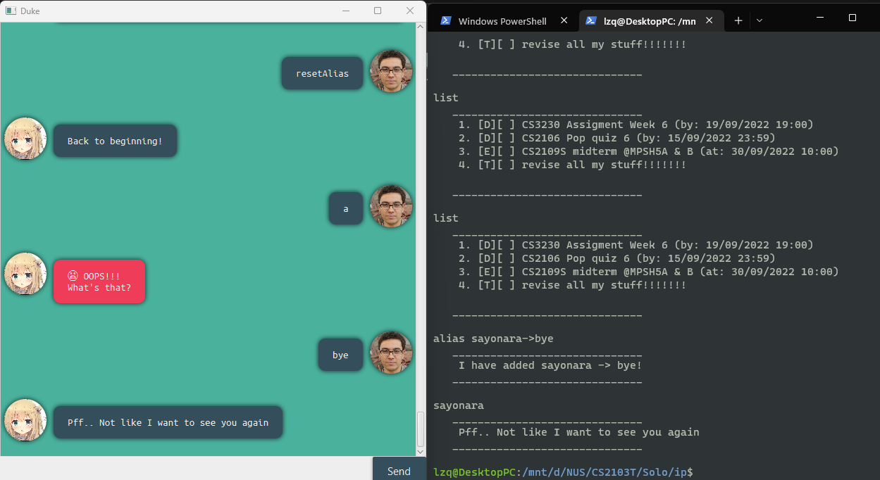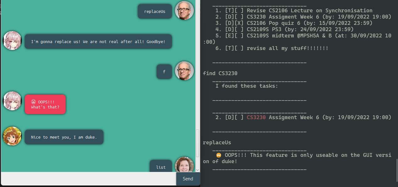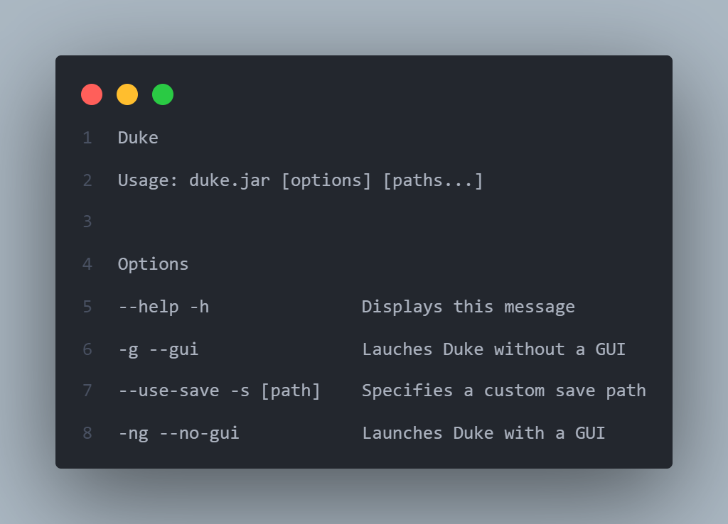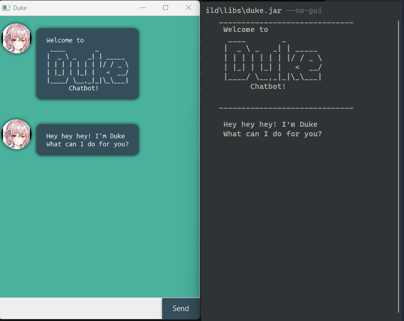 bye: To exit duke. (Note there will be a 2 second buffer for your to read the message before exiting on GUI)