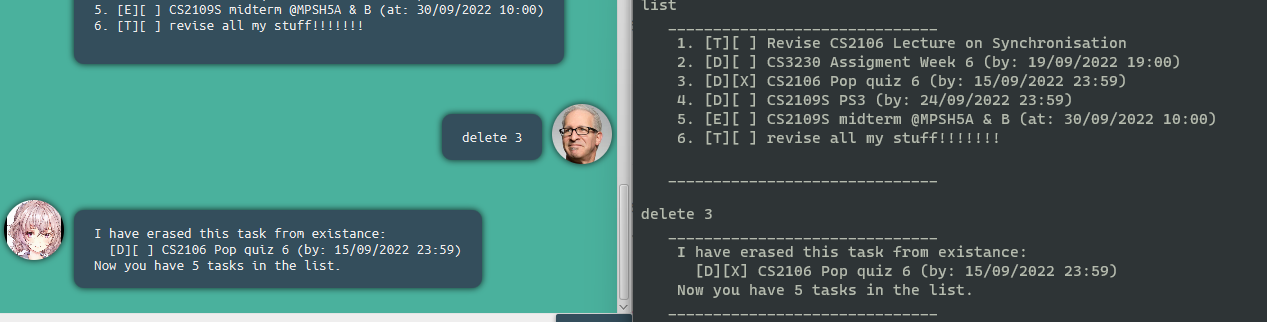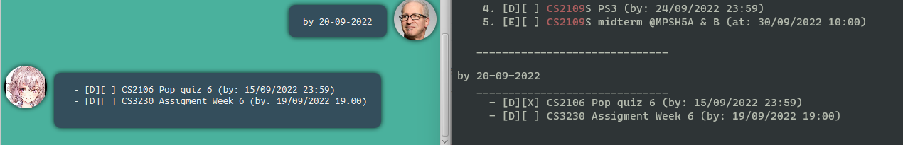deadline [task description] /by [datetime/string] e.g. deadline CS2109S ps3 /by This friday, deadline CS2109S ps3 /by 02/05/2022 |