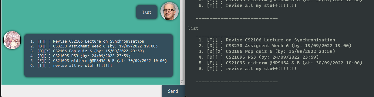 Duke is a desktop app for managing task optimized for both GUI and CLI usage! Packaged like a chat bot, Duke will provide you with a personalised service to help you track and manage your tasks.