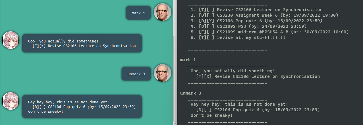 unmark [task index]e.g. unmark 1, ` unmark 4` |
